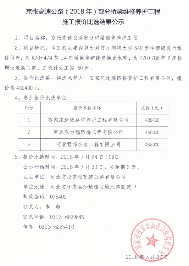 京張高速公路(2018年)部分橋梁維修養(yǎng)護工程施工報價比選結果公示