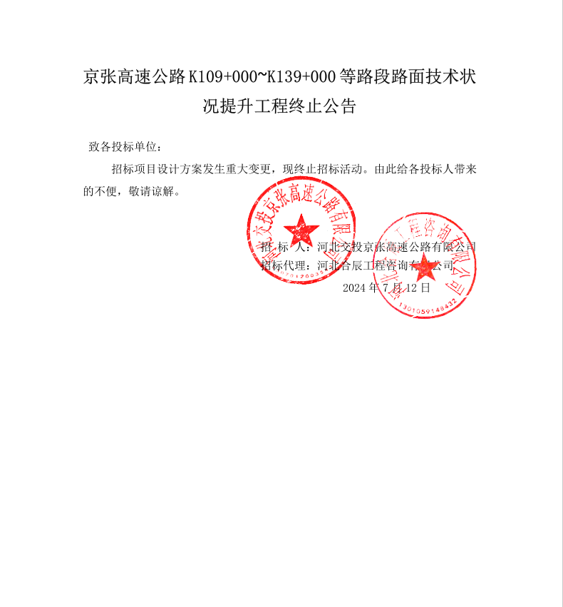 京張高速公路 K109 000~K139 000 等路段路面技術(shù)狀況提升工程終止公告